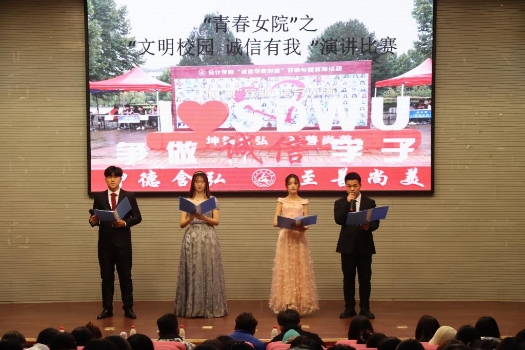 为营造明礼诚信、文明和谐的校园文化氛围,11月28日晚,“青春女院”系列活动之“文明校园,诚信有我”演讲比赛在图书馆一楼报告厅顺利举行。本次活动由校团委主办、会计学院和蓝翼演讲社团承办,来自各学院的百余名学生观看了本次比赛。