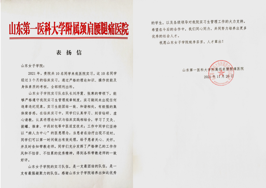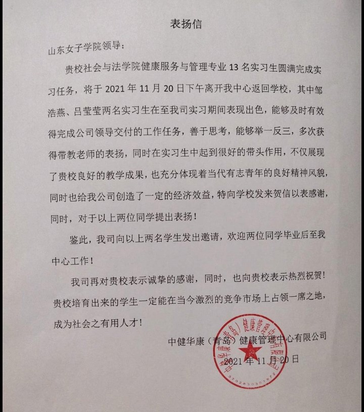 近日,学校收到山东第一医科大学、青岛平度中健华康健康管理有限公司等实习单位的表扬信,实习单位对健康服务与管理专业实习学生给予高度赞扬,认为实习学生学习认真、刻苦钻研、虚心请教,充分发挥了严以律己的工作作风和不怕苦、不怕累的工作精神,得到了各科带教老师的好评。