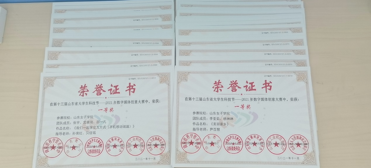 近日,第十三届山东省大学生科技节——“超感杯”山东省大学生数字媒体创意大赛决赛顺利举行,数据科学与计算机学院共有69支队伍参加了本次比赛,取得了一等奖3项、二等奖5项,三等奖17项、优秀奖44项的优异成绩。其中,数字媒体技术专业的胡宇涵、李亚茹、杨琳琳、张宇、宫萌萌、邵一凡等同学荣获一等奖;指导教师孙育红、庞胜楠等10名老师荣获优秀指导教师奖;学校获得优秀组织奖称号。