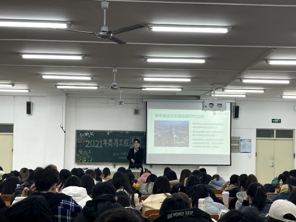 马克思主义学院教师焦路尧以《政治引领在我国青年政治文化发展中的批判与建构》为题做专题报告,他从自身专业领域出发,在理论层面阐释政治引领对青年发展的作用,以青年政治文化起源“五四运动”为出发点,从时代的角度观察青年政治文化的作用及意义,指出了我国青年在世界领域中应当展示担当,推动中国的国际形象向青年的“自塑”转变。焦老师生动形象的语言表达,温文尔雅的讲课风格,彬彬有礼的举手投足,恰到好处展现了学校青年教师的人格魅力。讲座现场气氛热烈,在场学员纷纷表示:“虽然是一场理论性很强的报告,但通过老师的解疑释惑,真正提升了自己的思想境界和理论水平。”