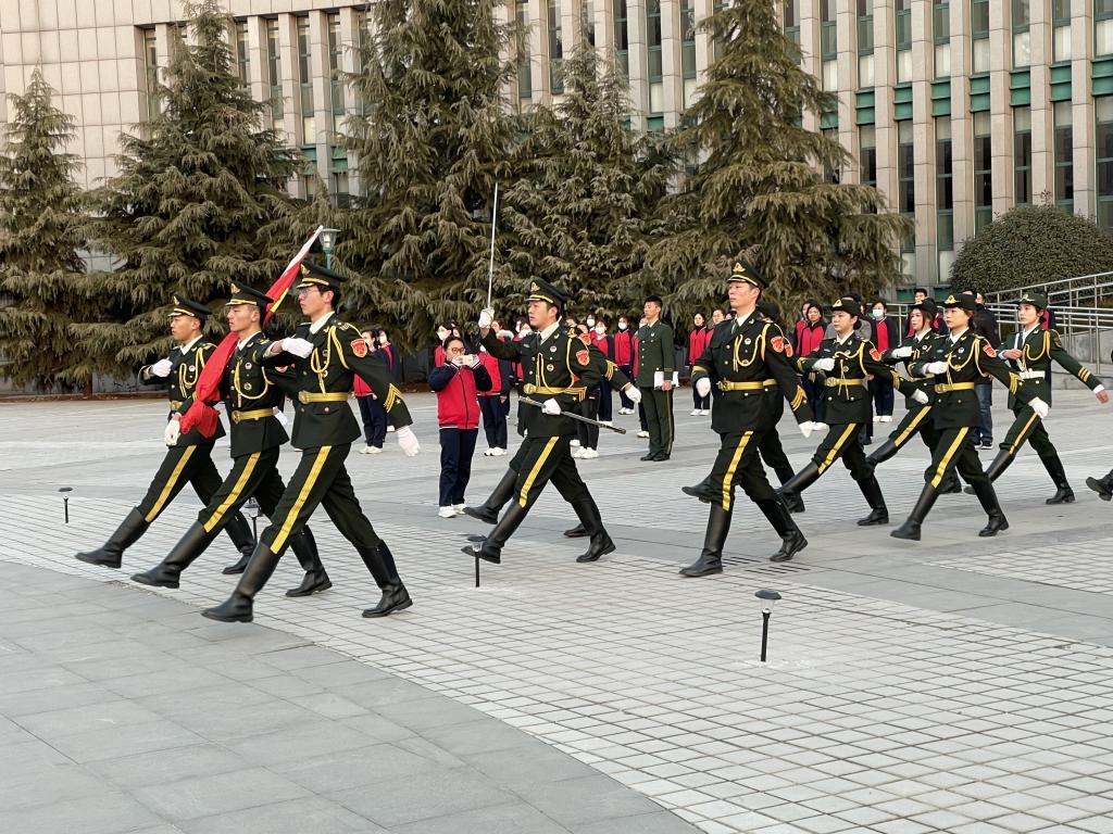 国旗护卫队队员迈着整齐矫健的步伐,护送鲜艳的五星红旗走向升旗台。当庄严的国歌声响起,全体师生行注目礼,五星红旗在巾帼广场冉冉升起,瞬间点燃的爱国激情,转化成新学期开启新征程、迎接新挑战、实现新目标的强劲动力。