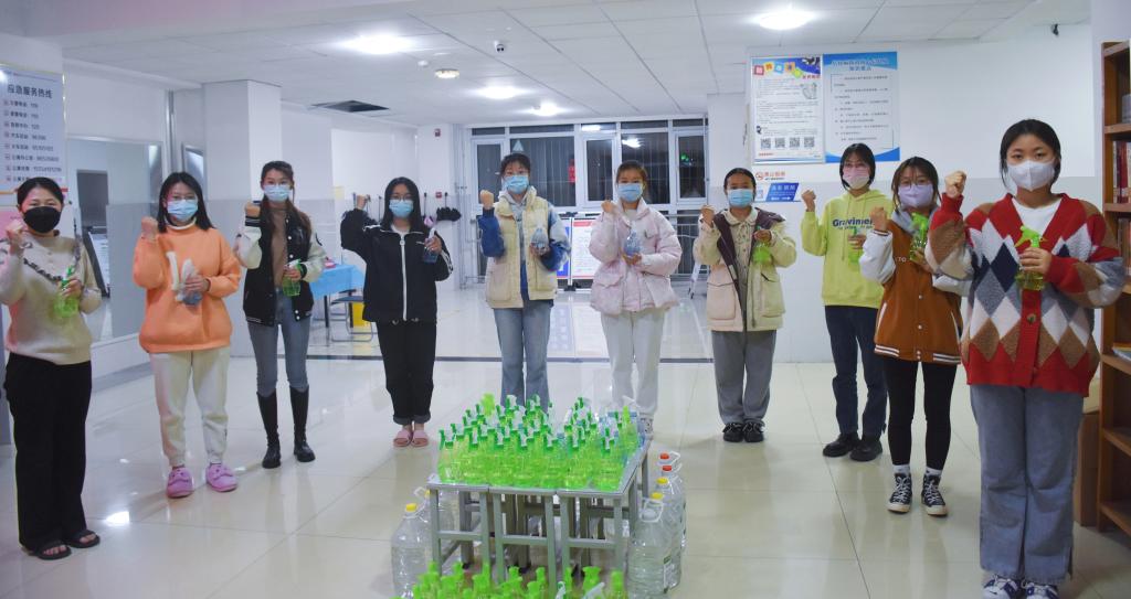 教育学院全体辅导员老师在结束了一天紧张工作后来到学生公寓进行酒精分装和发放,各班同学井然有序地排队领取消杀物资,大家在看到用酒精喷壶摆成的“加油”两字时,心中不禁泛起了阵阵暖意,更加坚定了师生同心抗疫的信心和决心。