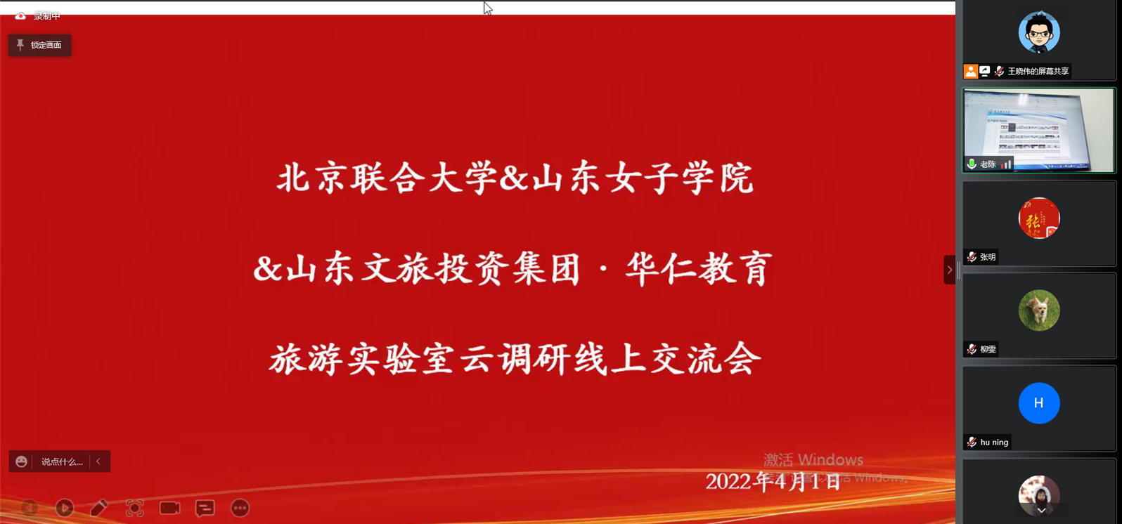 为加快旅游数字化实践数字化教学的转型,旅游学院3月18日-4月1日通过腾讯会议的方式分别召开了山东女子学院与海鳗云数据技术有限公司调研工作会议(以下简称“海鳗云调研会议”)、南开大学&山东女子学院&华仁教育旅游实验室云会议(以下简称“南开大学调研会议”)、北京联合大学&山东女子学院&山东文旅投资集团·华仁教育旅游实验室云调研会议(以下简称“北京联合大学调研会议”)以及华侨大学&山东女子学院&山东文旅投资集团·华仁教育旅游实验室云调研会议(以下简称“华侨大学调研会议”)。旅游学院院长张明、副院长许爱霞和相关教师以及华仁教育产业学院校企工作室总监于倩,南开大学、北京联合大学、华侨大学、山东文旅投资集团·华仁教育、海鳗数据技术有限公司部分成员参会。