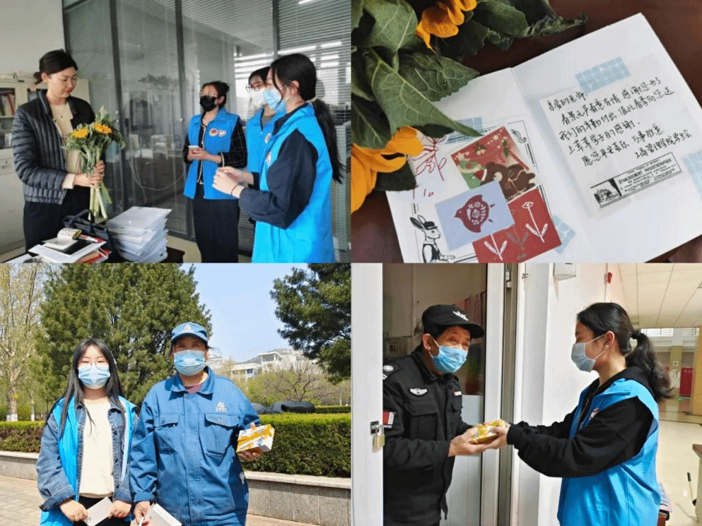 工商管理学院组织学生会成员为驻守学校的一线教职员工赠送了精心准备的祝福贺卡、向日葵花和日常用品等,为“舍小家为大家”的驻校工作者,送去温暖与关心,感谢他们的坚守与贡献。