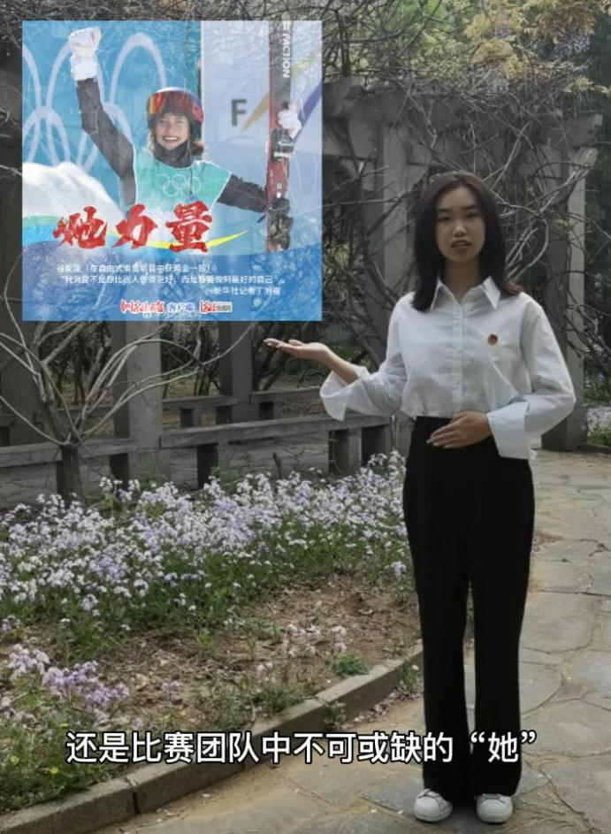 同学们自行取景拍摄,录制视频并剪辑制作。参赛者用激情澎湃的语言讲述了2022年北京冬奥会和冬残奥会上女性运动员们的突出表现和动人事迹。天才滑雪运动员谷爱凌、开幕式旗手郭雨洁、四战冬奥的徐梦桃、“双奥选手”张海原……这些感人至深的故事带领大家深刻感受了双奥会上的“她”力量。