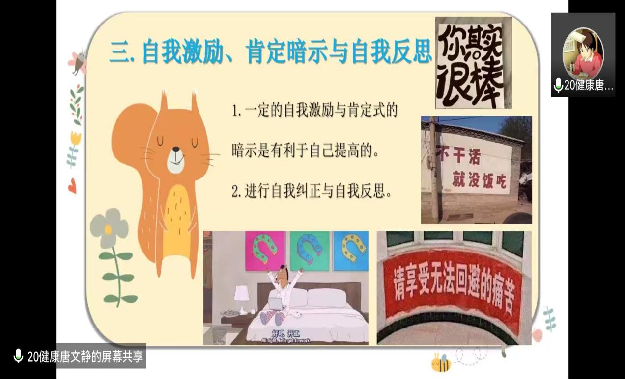 会议伊始,健康服务与管理专业教师赵娜介绍了分享会的目的和意义,并督促同学们努力学习、不断进步、积极面对大学生活,做好自己的人生规划。2019级三名学生代表高心雨、张寒和孟美辰分别介绍了英语学习技巧、科学制定考研目标和考研复习经验,让同学们对考研有了更深入的认识。2020级两位学生代表唐文静和周钰滢分享了专业课学习方法、个人规划、如何兼顾学习与活动、重视培养兴趣爱好、及时排解学习压力等方面的经验。2021级班级成绩第一的宋阳阳分享了如何尽快适应大学的学习生活环境,探索找到适合自己的学习方式。各年级优秀学生代表的分享各有侧重,又相辅相成,让同学们受益匪浅。