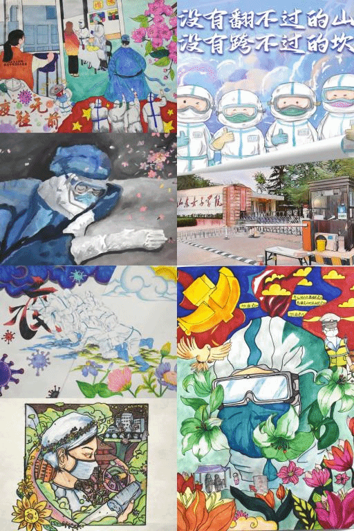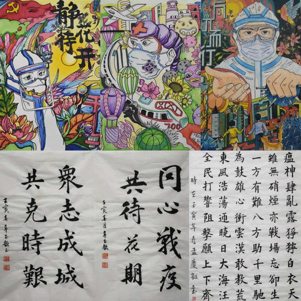丹青溢彩绘春晓,翰墨流芳赞英雄。当疫情侵袭华夏,同学们虽不在战“疫”一线,但依然在精神上与前线的战士们紧密相连,同学们们纷纷执笔操剪,在提按顿挫中描绘人间真情,在浓墨淡彩间点染热血抗“疫”。或是笔走龙蛇的苍劲线条,或是精巧雅致的板绘画作,都幻化为美好的战“疫”祝福,在这最瑰丽的季节里绽放成一树春华!