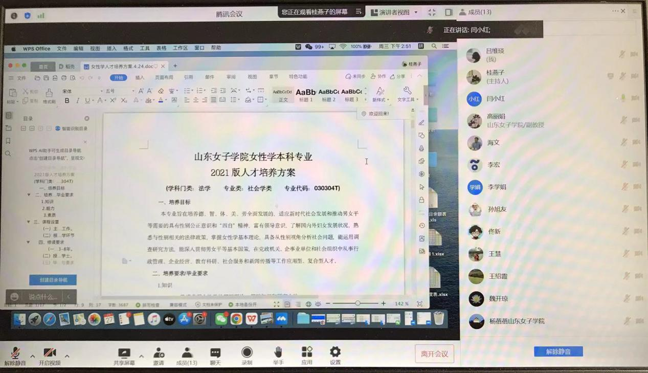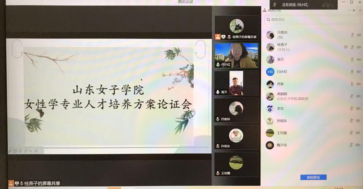4月27日下午,社会与法学院在腾讯会议召开女性学本科专业人才培养方案论证会。中国妇女研究会副会长、厦门大学博士生导师、山东女子学院特聘教授叶文振,北京大学社会学系博士生导师佟新教授,中华女子学院女性学系主任、硕士生导师魏开琼教授应邀出席会议。山东女子学院教务处副处长李宏、妇女研究与发展中心副主任王慧、社会与法学院副院长王绍霞、孙旭友、女性学专业全体教师参会。社会与法学院院长闫小红主持会议。
