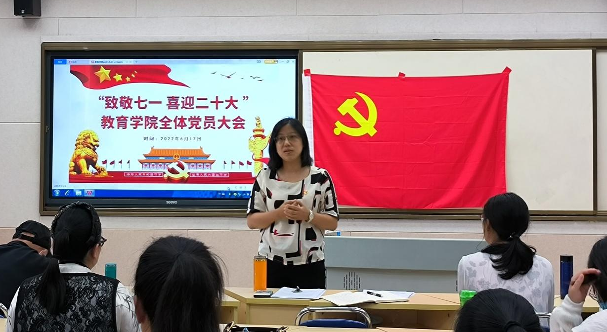 6月17日,教育学院召开学院“致敬七一 喜迎二十大”全体党员大会。会议由学院党委书记崔江宁主持,全体教师党员线下参加会议,学生党员线上参加会议。