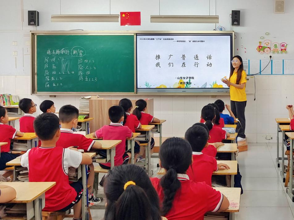 2022年暑假,“爱之语”志愿服务团面向潍坊市青州市云门山回民学校、济南市市中区党家街道小庄小学全体师生发出规范使用普通话倡议,依次开展“国旗下讲话,掀起推普潮”“小小主持人,推广普通话”“慧心加巧手,同抒推普情”“争当‘啄木鸟’,推普规范化”“推普入乡村,文明深入化”“口语多训练,推普日常化”等活动,通过以上活动及一堂堂普通话规范课和汉字规范课,帮助少数民族学生以及农村地区学生树立正确且规范使用普通话的意识,并用完整朗诵节目汇演的形式来展示孩子们的普通话学习成效。扶贫先扶智,扶智先通语。团队志愿者将用自己的知识和技能,帮助支教学校的孩子们讲好、用好普通话,增强孩子们社会用语用字规范水平,传承弘扬中华优秀语言文化,用实际行动迎接党的二十大胜利召开。