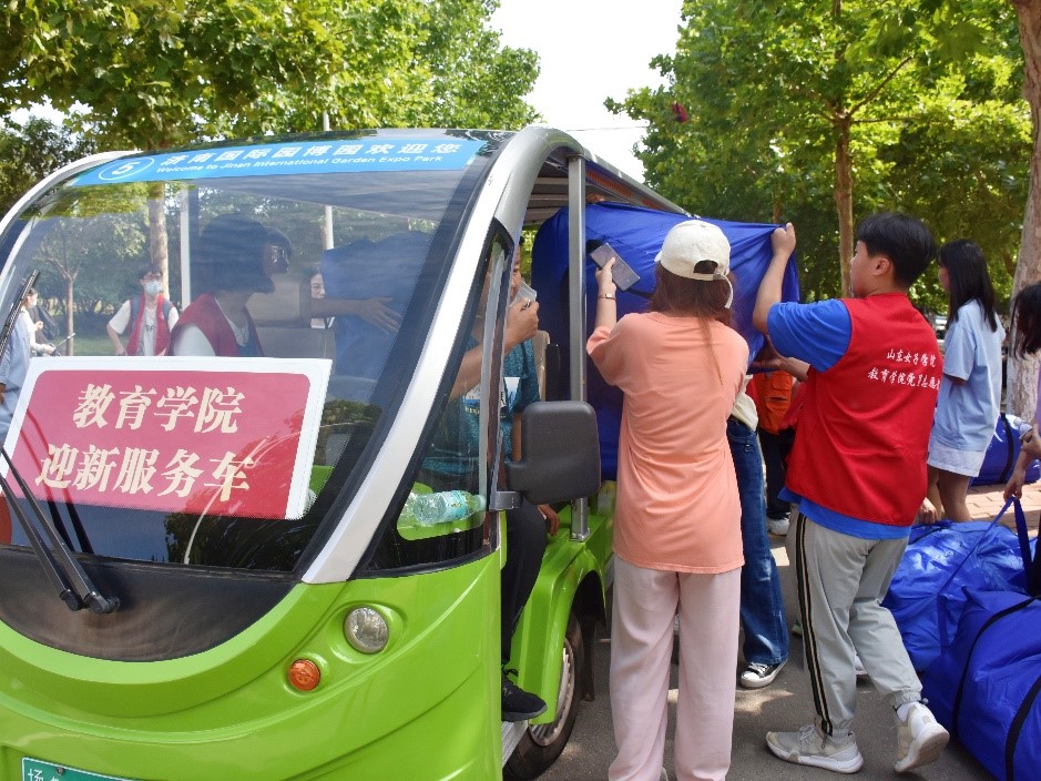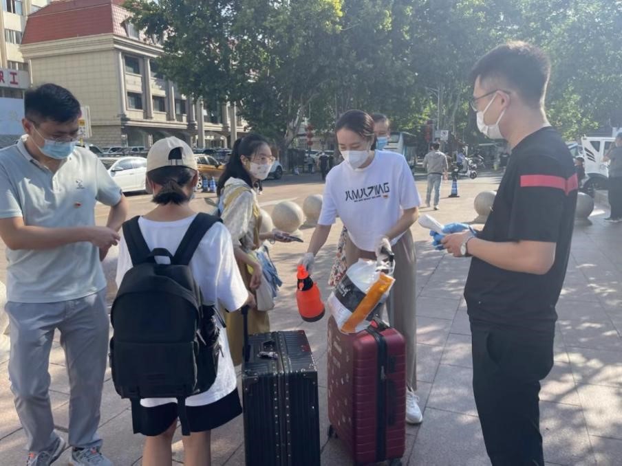 红色先锋在行动,暖意浓浓迎新生。迎新当天,炎热的天气丝毫没有消减党员志愿者们的服务热情。秉承“创先争优树旗帜,服务奉献做表率”的宗旨,党员们积极发挥示范作用,身体力行、服务师生。在各志愿服务点,3名教师党员早早到达济南站迎接来自全国各地的同学,为他们指引去学校的路线,解决急需问题。校门口处,每个时间段均有4名学生党员有秩序的引导新生入校做好核酸检测工作。南门门口旁设立的迎新服务点位,每个时间段都有2名学生党员热情积极地为到校新生答疑解惑,主动耐心指引道路,并为新生提供矿泉水、消毒液等物品,协助老师班助发放“萌新七件礼包”,提供1V1定制化服务。迎新现场、新生公寓处、综合训练馆每个时间段共有30余名志愿者指路领路、搬运行李。尽管一天的工作使得党员志愿者们大汗淋漓,但在新生们初来大学时喜悦的渲染下,志愿者们也未觉疲乏,反而有了更加赤诚的助人之心。