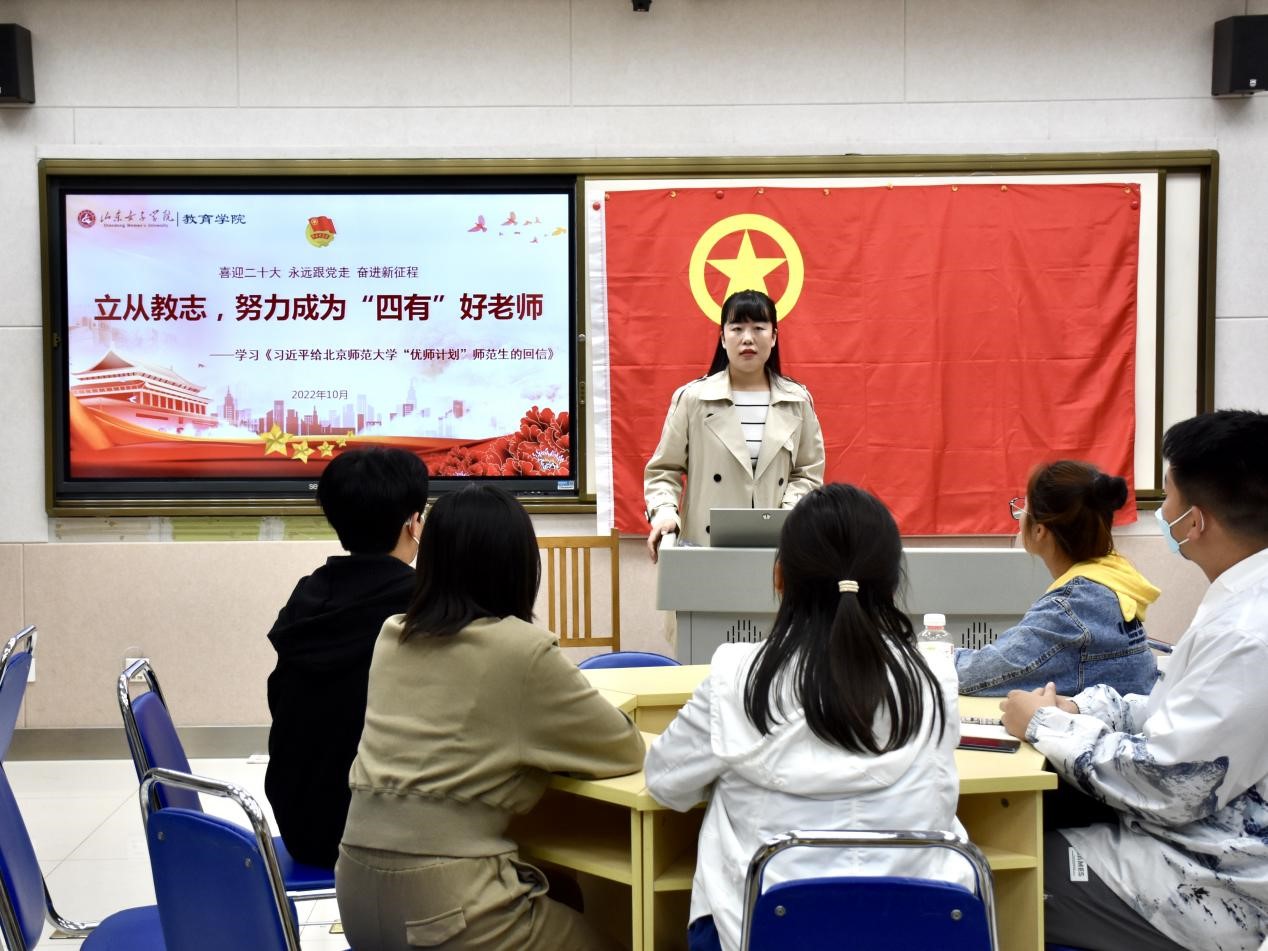会上,团总支副书记宋天娇指出同学们作为儿童健康成长路上的重要启蒙人、引路人和守护者,要深入学习习近平总书记重要回信精神,坚持和发扬“红色师范”的光荣传统,以小我融入大我,将个人理想与国家情怀相结合,做党和人民满意的“四有好老师”,以赤诚之心坚定理想信念,以奉献精神提高道德修养,以进取之心充实专业知识,以仁爱之心扎根三尺讲台,让青春之光闪耀在为梦想奋斗的道路上。