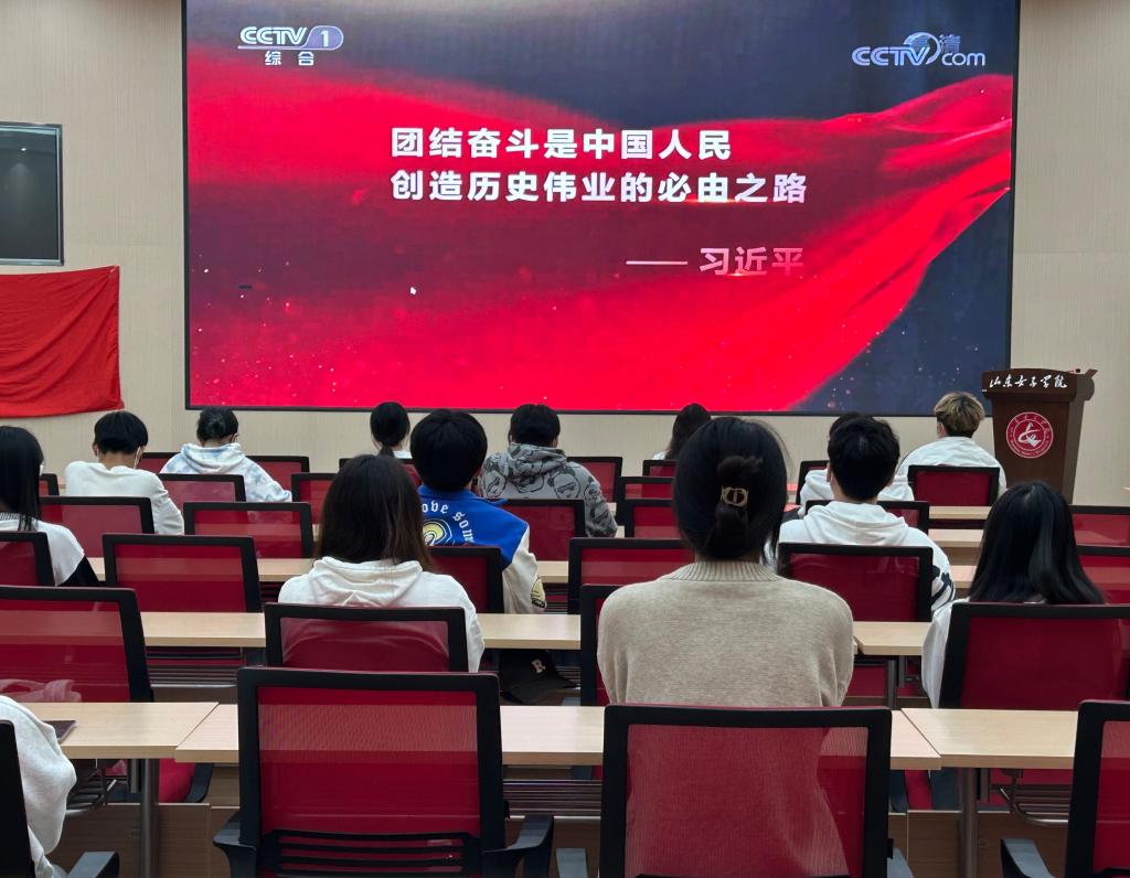主题团日在团歌中拉开帷幕。在支部书记带领下,与会人员从学习党的二十大的意义、了解二十大报告的重要论述以及青年应该如何作为,集体集体学习党的二十大报告等。随后,全体共同观看《领航》纪录片第16集《踔厉奋发》,一起感悟“团结奋斗是中国人民创造历史伟业的必由之路”的内涵意义。集体学习后,开展党的二十大知识“抽题问答”环节,伴随着活泼热烈的现场气氛,广大同学围绕党的二十大报告展开热议讨论,支部内的入党积极分子代表、入团积极分子代表以及班级学习标兵上台分享学习感受,团支部书记做了总结发言。最后,主题团日在重温入团誓词中结束。