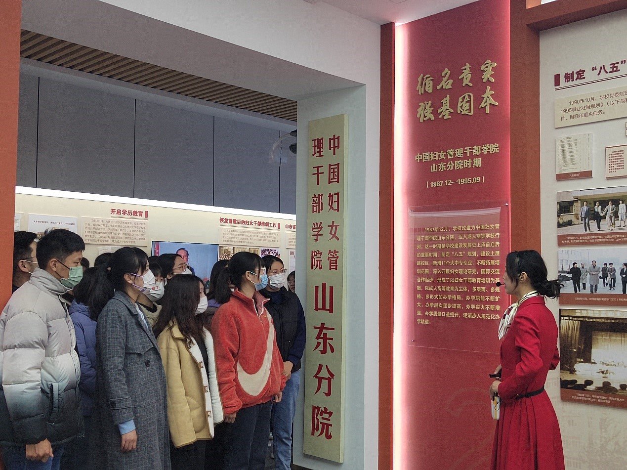 参观过程中,学生党员们多次驻足观看,从一段段文字、一张张图片中感受着学校厚重的历史积淀、丰硕的办学成果和不断攀登的女院精神。
