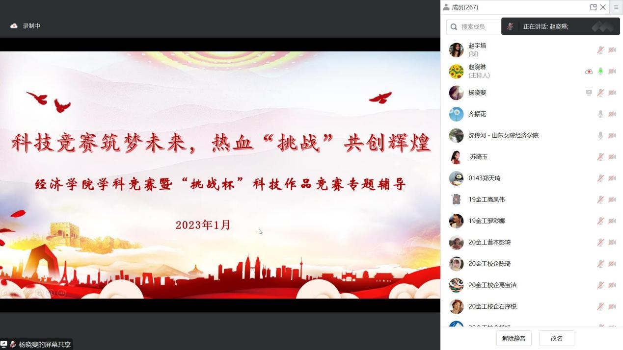 为积极培育科研项目,营造良好的学科竞赛氛围,提高学科建设水平,1月15日下午,经济学院邀请山东大学宁亚飞博士对“挑战杯”赛事进行专题辅导。本次辅导通过腾讯会议线上举行,经济学院领导班子成员、全体教职工、“挑战杯”学生团队队长及骨干成员参加了会议,会议由党总支书记齐振花主持。