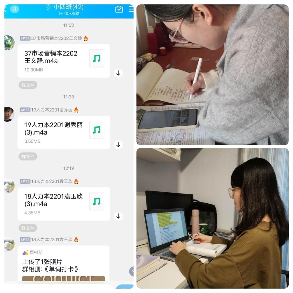 参加“云英语”板块的同学们,线上使用“百词斩”“每日英语听力”软件进行每日单词打卡与听力训练,每周二、周六进行线上交流研讨与口语训练,在听、说练习中提升英语薄弱技能点,弥补单词打卡短板。线下,同学们记录自己的学习内容并定期上传学习成果。大家积极在“社区”群中分享自己的学习经历和学习经验,不仅养成了良好的英语学习习惯,提升了自己的语言技能,还在参与社群交流的过程中收获了同学们分享的英语学习干货。