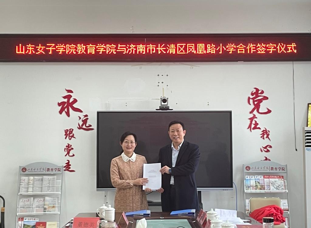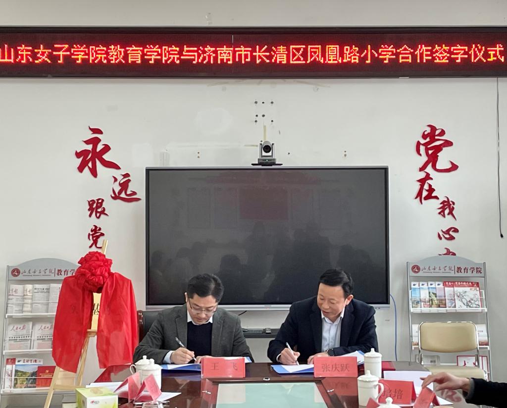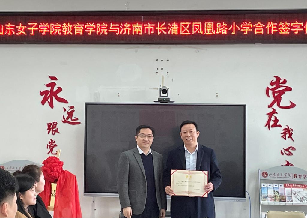 王飞与张庆跃签署了“山东女子学院教育学院实习基地”协议书,为张庆跃颁发了“校外导师”聘书。横向项目负责人陈晓燕教授与凤凰路小学签订了横向项目合作协议书。