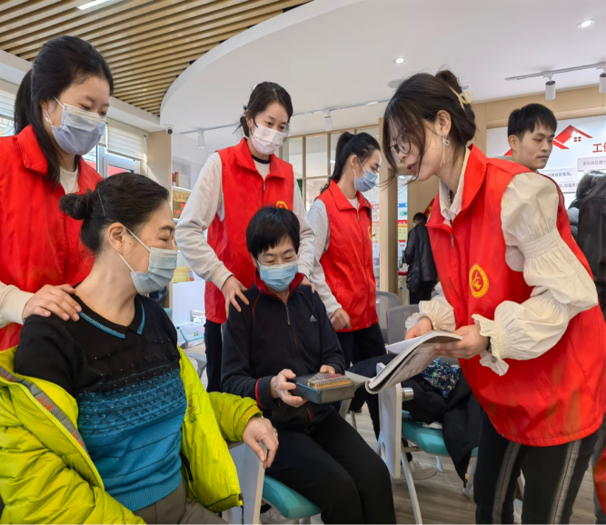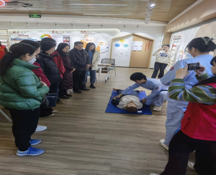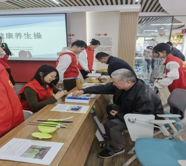 养老服务管理专业和健康服务与管理专业的学生志愿者们向老年人普及了保健和急救知识、用假人道具现场演示了心肺复苏的正确流程,并领带领社区居民学做健康养生操。社区老年人还体验了益智磁力棋和特色积木等乐龄游戏,练习用乐鼓和手指琴等适老化乐器进行手部锻炼,了解了适老化食用具等家居产品。