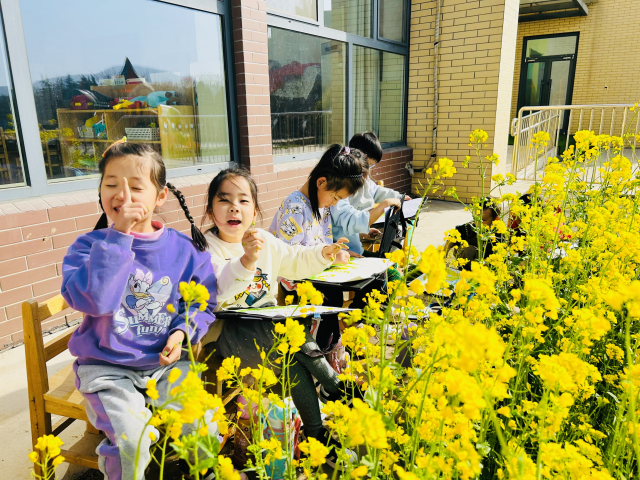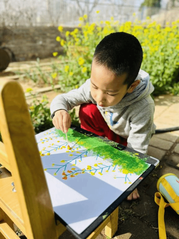 幼儿们在教师的带领下亲手拿起小铲子播种,齐心协力种下一棵棵小树苗,给土地浇水、施肥,忙的不亦乐乎。他们用勤劳种下希望,期待花朵绽放的芬芳和秋日的累累硕果。种植结束后,幼儿们观赏着园中五彩缤纷的花朵、寻找悄然冒芽的嫩绿小草,在盛开的油菜花丛中感受春天的到来,并用手中的画笔描绘春天的色彩。
