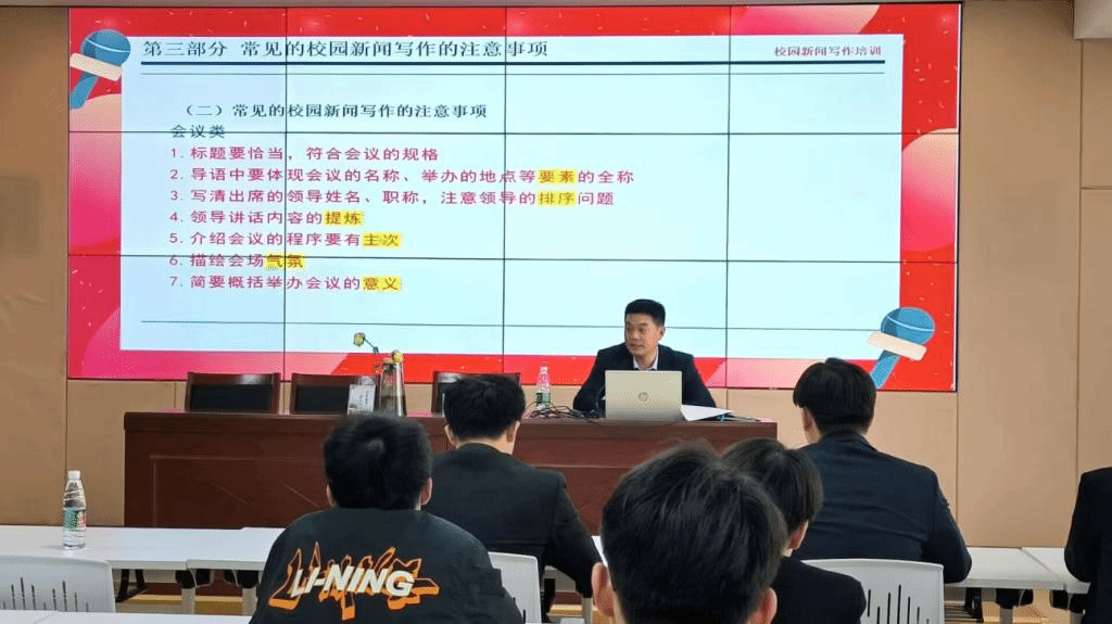 首先,杨洋进行了题为“加强新媒体时代下的学院宣传工作”的讲座,结合新时代新媒体的背景,强调了宣传工作的重要性,理论联系实际,从校园新闻稿的基本结构、写作技巧与方法、写作注意事项等几个方面进行了深入讲解。然后,吴玉霞分析了同学们平时在新闻稿件写作中的常见问题,并对同学们提出要加强写作能力锻炼,努力成为“坐下来能写,站起来能说,走出去能干”的优秀人才的希望。最后,院学生会主席刘芊代表全体参会同学进行总结分享,表示将积极学习领悟会议内容,深入思考,加强练习,为“写好学院新闻 讲好学院故事”做出自己应有的努力和贡献。