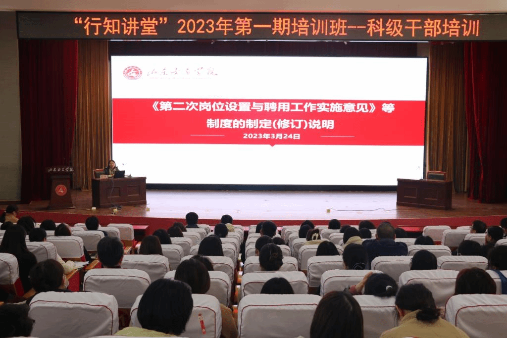 3月24日下午,学校举办“行知讲堂”2023年第一期干部培训班-科级干部培训,本次培训的目的是为了促使广大科级干部进一步把握学校四届二次“双代会”上通过的一系列人事人才改革制度文件精神,推动广大科级干部主动融入学校改革发展。本次培训邀请了人事处副处长周杨和学生处副处长赵贵阳就相关文件制度进行详细解读。会议由党委委员、组织部部长富元斋主持,全体科级干部参加培训。