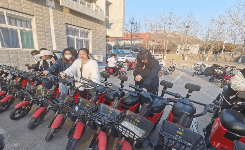 “校园保卫”雷锋岗志愿者摆放周边乱停乱放的共享单车