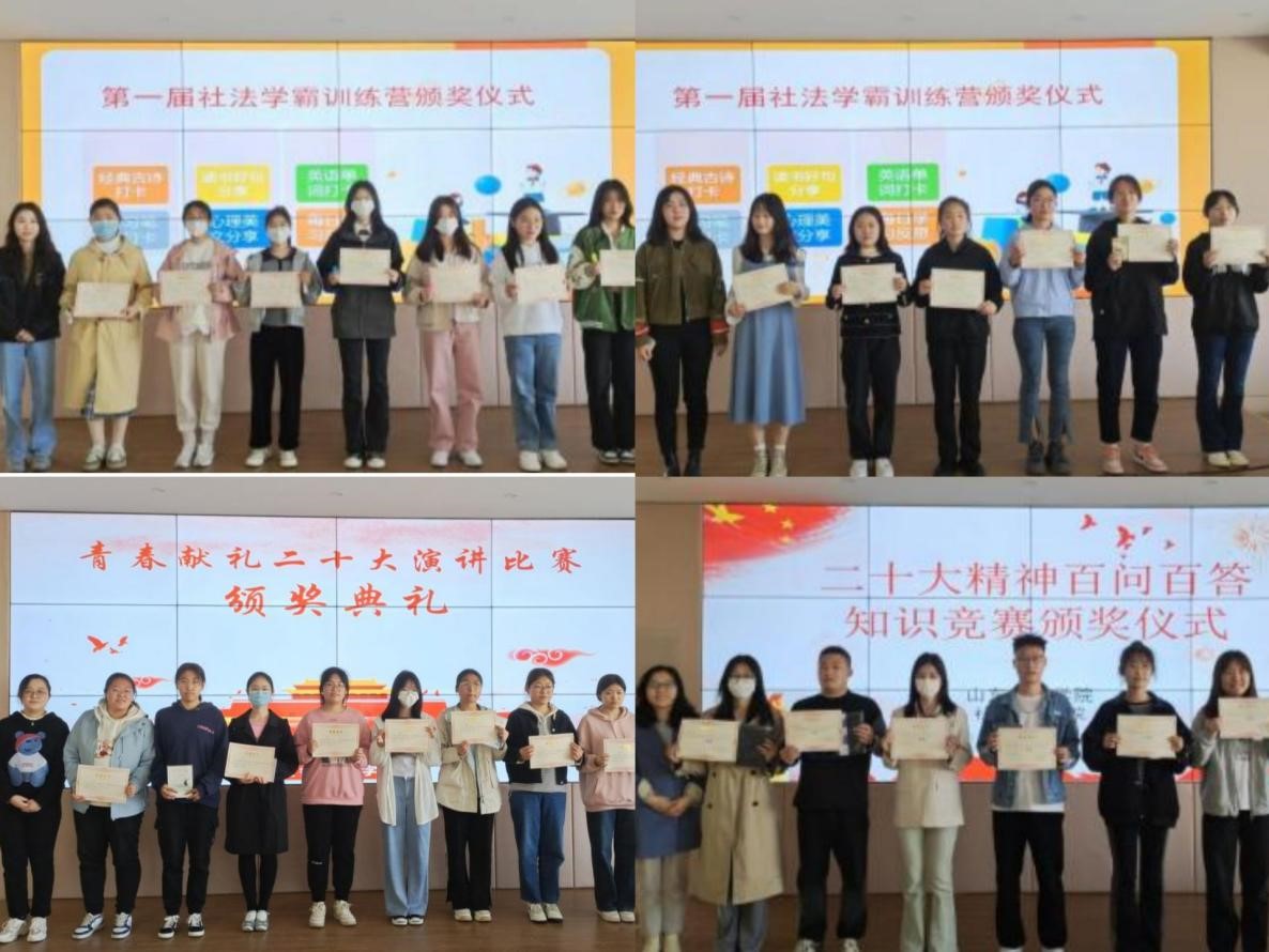 大会伊始,杨洋为在“省级三创赛”、“互联网+大赛”和“省级社工案例大赛”、“山东省学宪法讲宪法比赛”等省级学科竞赛中获奖的学生颁奖,鼓励学生们在新学期、新比赛中再创佳绩。张扬、刘汝婷老师为在“党的二十大精神百问百答知识竞赛”、“青春献礼二十大演讲比赛”中脱颖而出的学生颁奖,对学生们积极学习党的二十大精神予以充分肯定,并指出青年学生应当积极向党组织靠拢,以更加多元化的形式在实践中不断丰富自己的内涵。党委副书记吴玉霞为在“挑战杯课外学术作品竞赛”中获奖的学生颁奖,对学生们“崇尚科学、追求真知、勤奋学习、锐意创新、迎接挑战”的态度予以表扬。王晴晴、吕雅琦老师为在第一届学霸训练营中取得优异成绩的学生颁奖,总结了第一届训练营的成果,宣布开启第二届学霸训练营,学霸训练营负责人柏闰春从英语单词打卡、新闻稿写作、每日学习笔记打卡、心理美文阅读打卡、竞赛分享专项训练营、二十大金句打卡六个专题进行开营介绍,鼓励学生积极参与、认真对待学霸训练营活动。大会最后,吴玉霞对本次表彰大会进行总结,再次对获奖学生给予祝贺和表扬,希望广大同学在未来砥砺前行依旧,无悔青春,无愧自己。