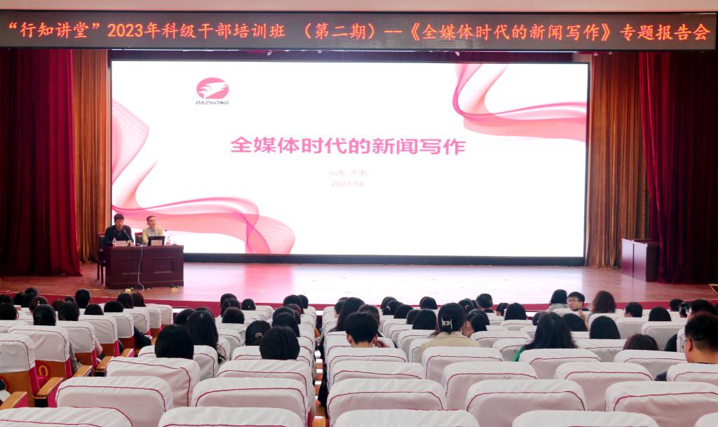 为全面提升学校新闻宣传工作能力和水平,加强新闻宣传工作队伍建设,4月14日下午,学校举办“行知讲堂”2023年第二期科级干部培训班暨“全媒体时代的新闻写作”专题报告会。本次培训邀请大众日报平台合作工作室副主任梁开文以《全媒体时代的新闻写作》为题作辅导报告。会议由党委委员、宣传部部长王鲁主持,全体科级干部和各级党组织宣传委员聆听报告。