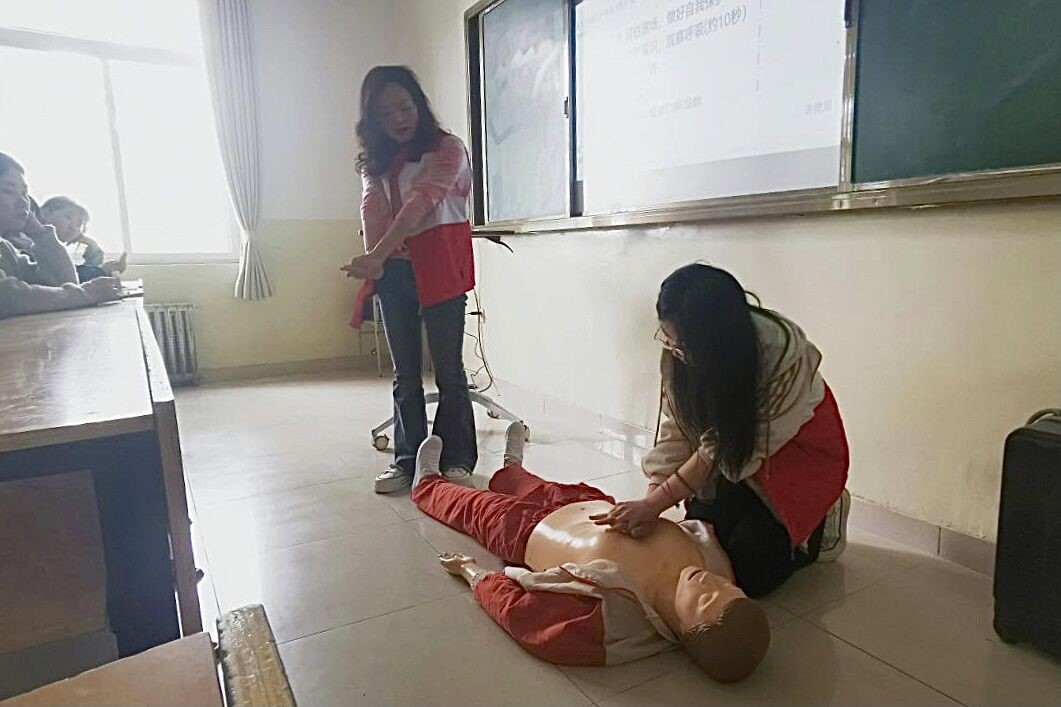 在长清区红十字会救护培训部主任韩辉的带领下,学院志愿者提前进行了统一培训。培训师先后强调了学习心肺复苏术的重要性,讲述了如何判断救助者是否需要心肺复苏,包括意识、呼吸、心跳的判断,讲述了心肺复苏的主要形式并具体讲解了救助过程中需要注意的问题和经常出现的错误,最后教给大家判断心脏复苏有效的指征。学院志愿者协助培训师进行教学授课,在对成人心肺复苏、儿童心肺复苏等相关知识进行详细讲解后,组织在现场师生进行了模拟练习。