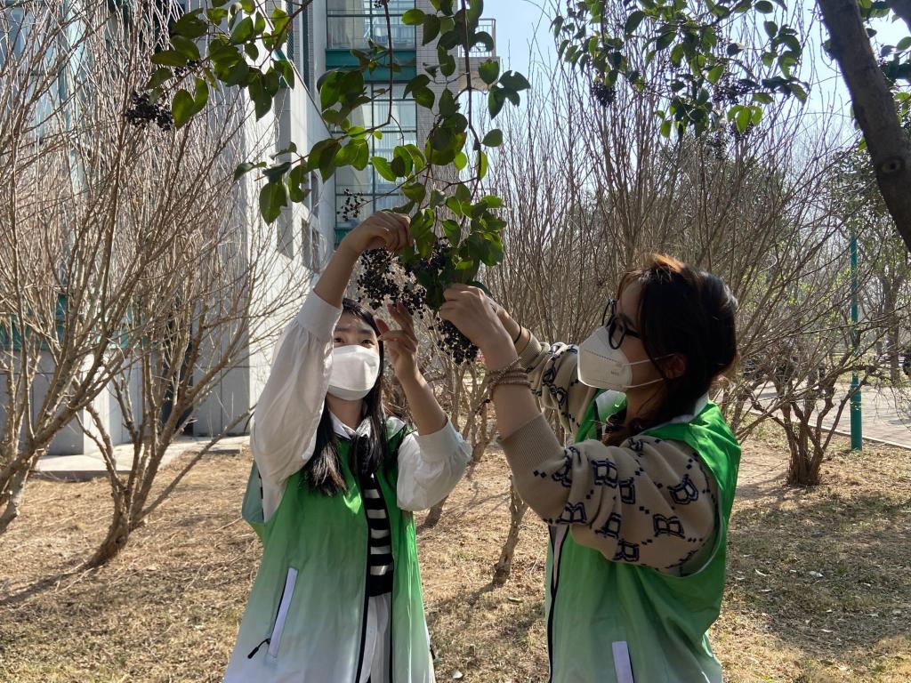 活动当天,同学们早早来到工坊,在老师的指导下明确分工。女生们负责前往图书馆、山坡等地采摘扎染所需的染料原料-女贞子,她们细心地在树叶中挑选成熟的果实,将它们小心翼翼放入袋中,然后返回博艺工坊将女贞子一一摆放晾晒,等待彻底晾干后便可煮成染料。男生们纷纷拿起锄头、铁锨翻地、平土,并码齐砖头、锄掉杂草、浇水湿地,为下一周的施肥、播种做好准备。在劳动期间,同学们井然有序,干劲十足,他们在骄阳下挥汗如雨,将劳动精神落地生根。