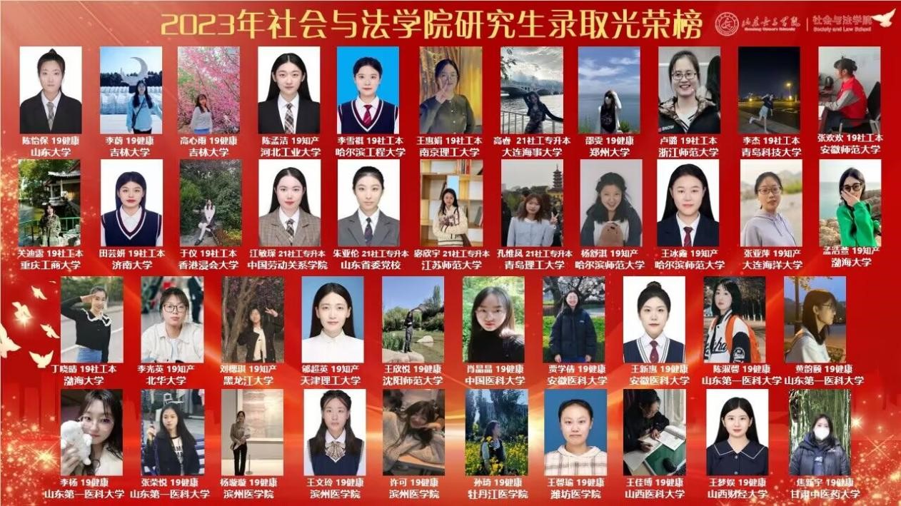 近日,随着2023年全国硕士研究生招生录取工作接近尾声,社会与法学院毕业生考研成绩再创新高。学院2023届本科毕业生共179名,110名同学报考研究生,53名同学上线,43名同学被录取,上线率29.6%,录取率24.02%,其中不乏山东大学、吉林大学、香港浸会大学、哈尔滨工程大学、南京理工大学等知名高校。健康服务与管理专业2023届毕业生50人,20名同学被录取,录取率达到40%。