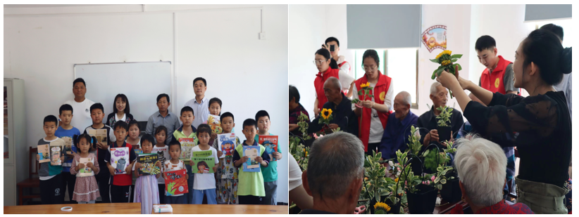 志愿服务队以爱老助老为主要目标,开展了教练健身操,“妙手生花”、“骰子游戏”、“平衡叠塔”,健康宣讲活动,有效帮助老年人缓解了负面情绪,灵活手脑,提高团队协作能力,让老人对慢性疾病有更加清晰的认知。同时,杨洋代表学院向村内儿童捐献绘本;陈殊君带领老人亲手制作了节日花篮;志愿者持续关注老年人健康问题,走访入户进行建档立卡;志愿者带领儿童开展“儿童树叶画”、“绘本阅读”、“盲人和哑巴”等项目,激发儿童想象力,同时体会父母对自己的关心,表达感恩之情。活动最后,志愿服务团队与老人儿童一起合唱红歌,为祖国母亲献上祝福。