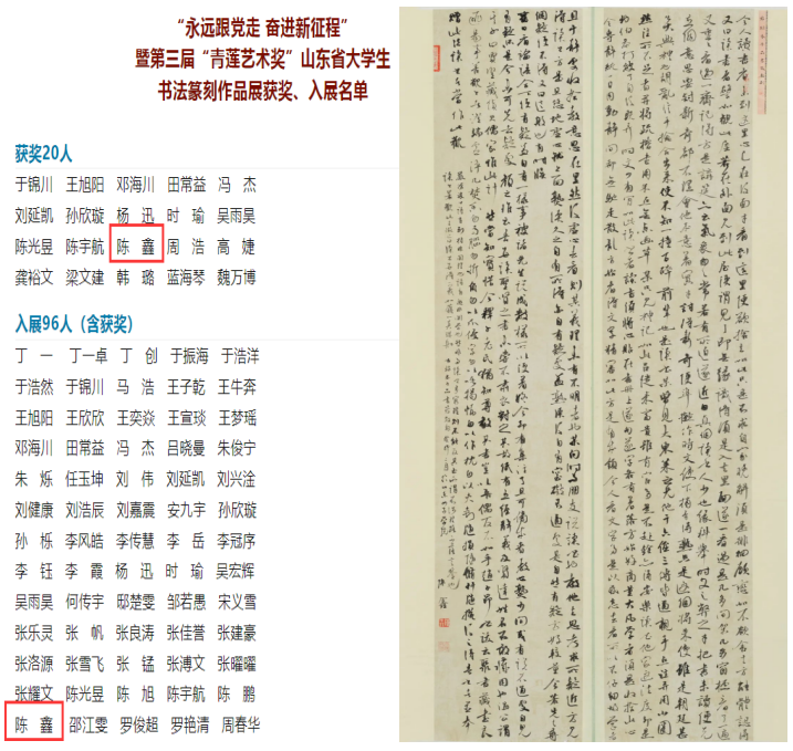 由共青团山东省委、山东省文化和旅游厅、山东省文学艺术界联合会、山东省青年联合会主办,山东省书法家协会、山东省文化馆、山东省青年书法家协会承办的“永远跟党走 奋进新征程”暨第三届“青莲艺术奖”山东省大学生书法篆刻作品征集共收到1835件作品,其中有效作品1646件。经过评委认真细致的评审,最终有96件作品入展,其中20件作品获奖,艺术设计学院20级陈鑫同学作品获奖并入展。