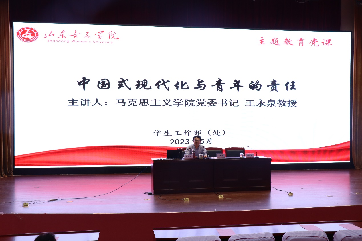 学校组织马克思主义学院教师深入学生开展系列宣讲活动。马克思主义学院党总支书记王永泉教授受邀以《中国式现代化与青年的责任》为题,线上线下相结合为学生讲授了一堂思政课。他详细解读了新时代新征程党的中心任务,中国式现代化的中国特色、本质要求和重大原则,推进中国式现代化要正确处理好的重大关系,新时代青年在中国式现代化征程中的责任这四个命题。同时,他强调,实践告诉我们,中国共产党为什么能,中国特色社会主义为什么好,归根到底是马克思主义行,是中国化时代化的马克思主义行。他勉励大家作为女院的主要学生干部,更要做有理想、敢担当、能吃苦、肯奋斗的新时代好青年。