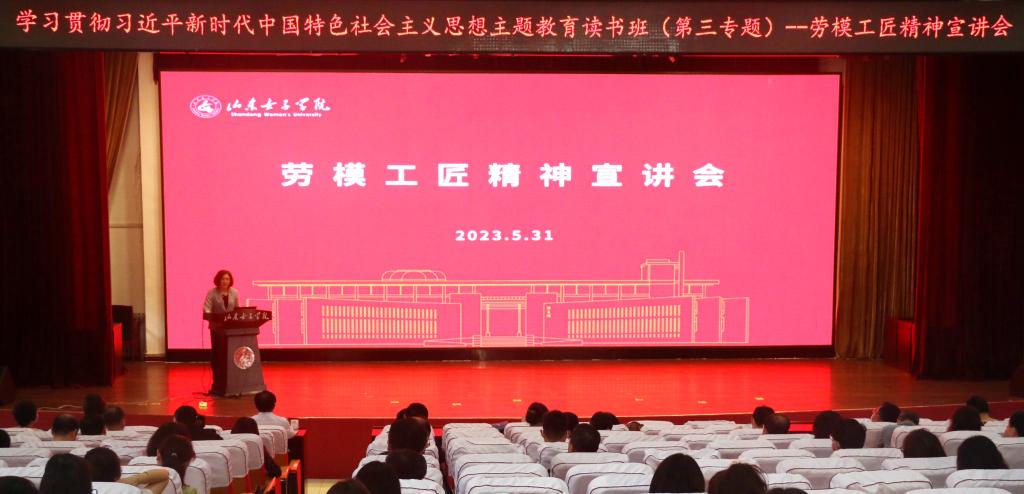 在学校深入开展学习贯彻习近平新时代中国特色社会主义思想主题教育之际,5月30日,学校在图书馆二楼报告厅举办“劳模工匠精神进校园”宣讲会。此次宣讲会也是深化“中国梦·劳动美”主题宣传教育,弘扬劳动精神、劳模精神、工匠精神,激励广大师生砥砺奋进,敢于担当的重要举措。宣讲会由学校工会、妇委会主办,邀请党的二十大代表、全国五一劳动奖章获得者、济南超意兴餐饮有限公司仓储物流主任张海燕和全国五一劳动奖章获得者、学校工商管理学院院长张可成教授受邀分别作题为《奋斗是人生最美的底色》和《撸起袖子加油干——只争朝夕》的宣讲报告。
