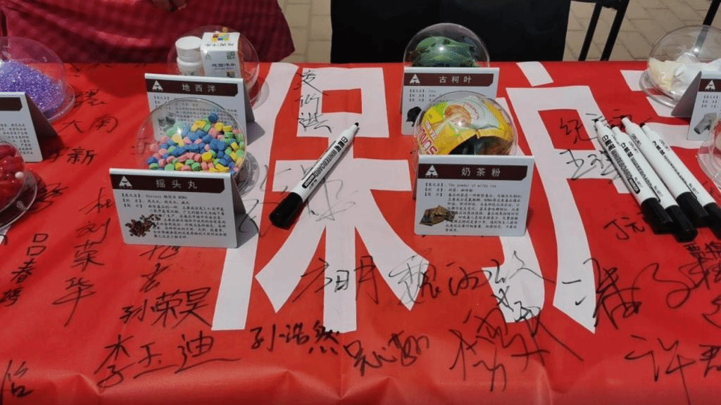活动现场,山东女子学院驻校高级警长傅士勇为参与活动的师生详细介绍了36种毒品仿真样本并回答了师生的提问,大学生安全自治委员会的志愿者也为师生们发放了《禁毒宣传手册》。师生们一边参观和听取讲解,一边在横幅上踊跃留下了自己的签名。