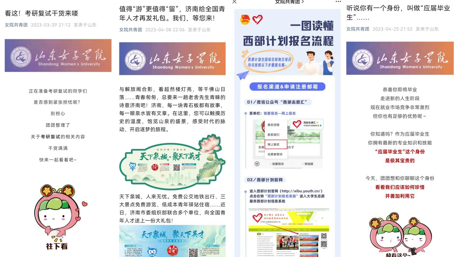 共建“青鸟驿站”平台。与潍坊、淄博、德州地方团组织共建“青鸟驿站”22个,打造女院学子就业的有效阵地,建立求职“第一站”;建设“青年之家”平台。在学校学生社区“一站式服务大厅”设置青鸟服务站,为学生提供地方政策解读、岗位推介、简历诊断等服务;用好“团团微就业”平台。组织团干部与家庭困难、学业就业困难学生“一对一”结对,建立帮扶工作台账,按照“一人一档”“一人一策”提供就业服务,确保困难学生充分就业,结对帮扶就业率100%;打造“暖心服务”平台。通过“与青年学生面对面”、学生会“好小益”等,掌握毕业生需求,开展毕业生暖心服务,为学生送爱心大礼包,拉进学生与学校之间的情感,“多互动,增理解”。