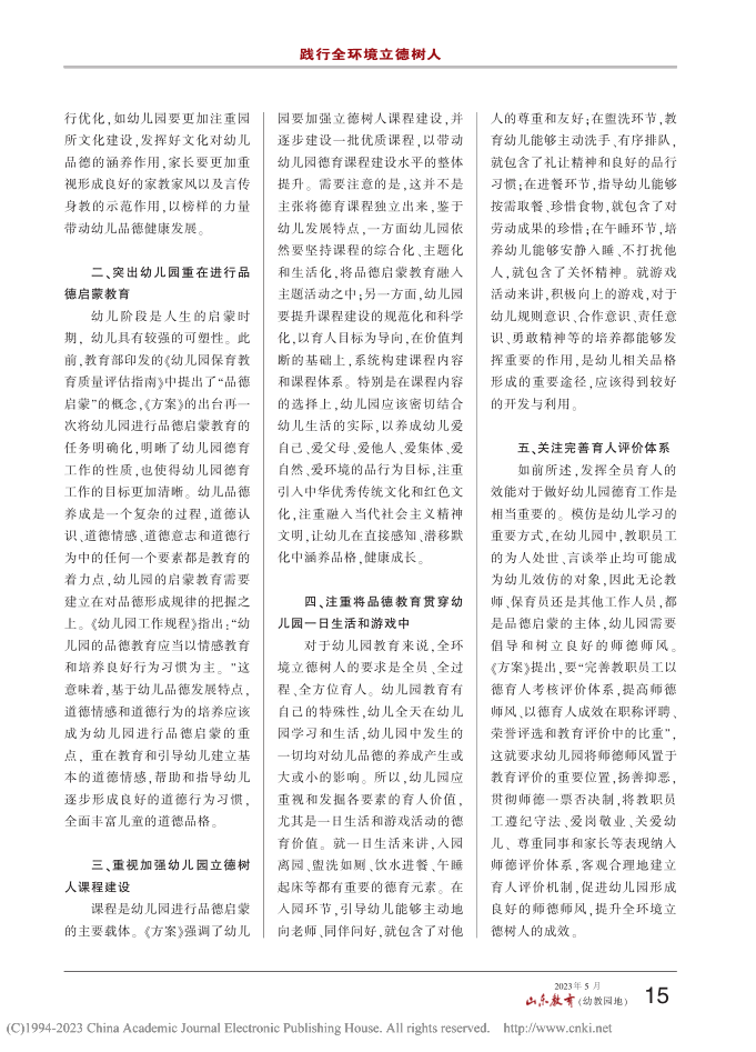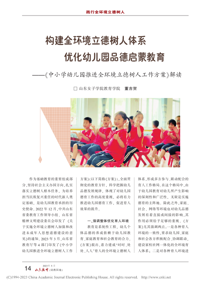 作为基础教育的重要组成部分,坚持社会主义办园方向,扎实落实立德树人根本任务,为培养担当民族复兴重任的时代新人奠定基础,是幼儿园教育承担的历史使命。2022年12月,中共山东省委教育工作领导小组、山东省精神文明建设委员会印发了《关于实施全环境立德树人加强和改进未成年人思想道德建设的意见》的通知。2023年3月,山东省教育厅等4部门印发了《中小学幼儿园推进全环境立德树人工作方案》(以下简称《方案》),全面贯彻党的教育方针,科学把握幼儿品德发展规律,体现了对幼儿园德育工作的高度重视,必将有力推进幼儿园德育工作,促进育人效果的提升。