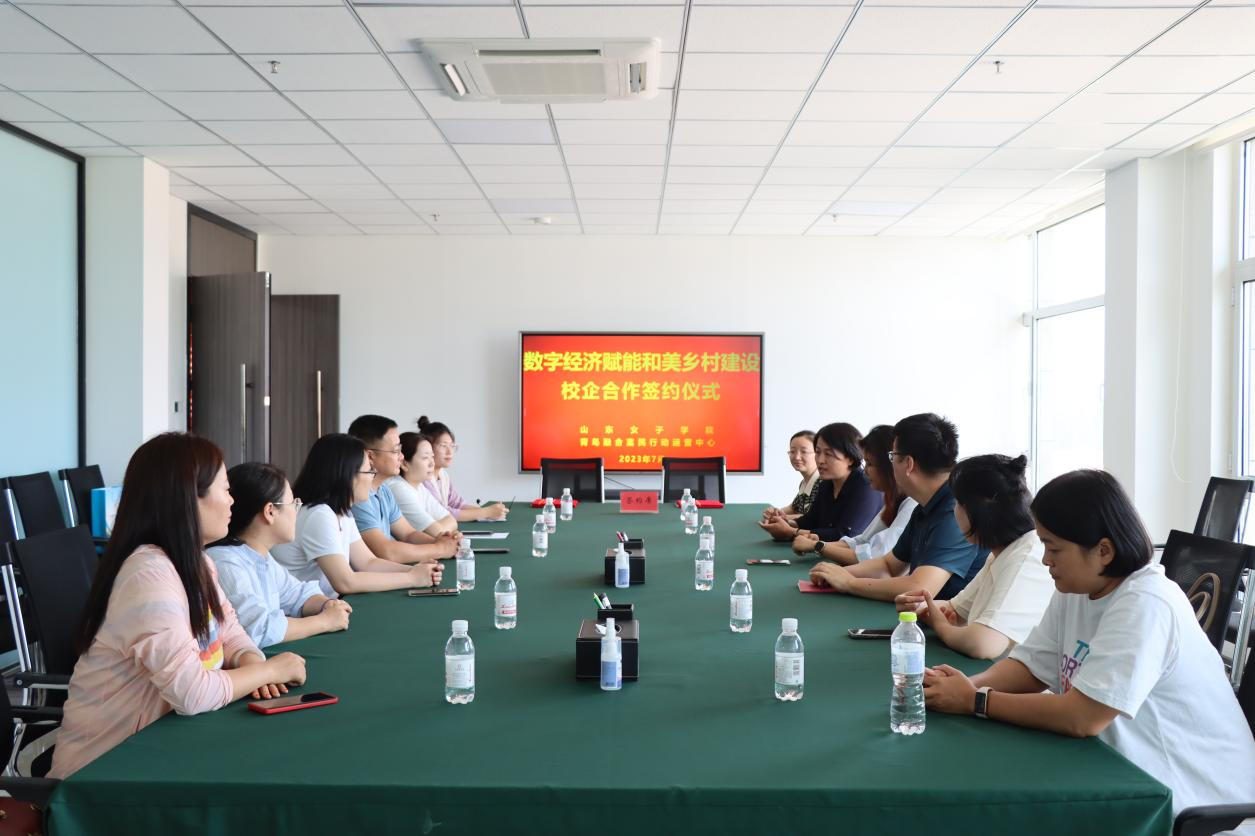 在青岛西海岸六汪镇融合富民投资发展集团建设的融合富民行动运营中心里,苏婧、齐振花一行深入“德育乡村”体验中心、农村产权交易中心、非物质文化遗产体验中心实地走访调研,对乡村产业振兴、人才振兴、文化振兴、生态振兴、组织振兴的新模式有了更深入细致的了解。走访调研后,齐振花与高璇签订了“数字经济赋能和美乡村建设”校企合作协议,并就探索建设校企合作新模式、提升学校数字经济复合型人才培养能力和社会服务能力、为山东省发展提供高水平应用型人才支撑等进行了深入座谈交流。