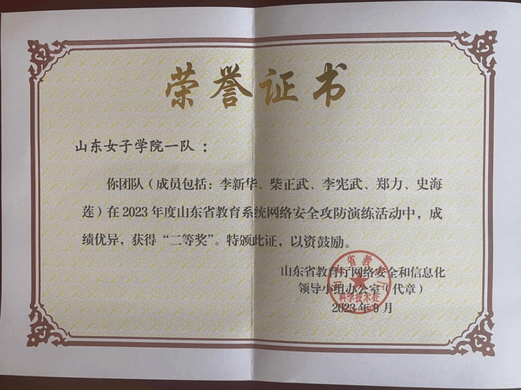 9月12日,由省委网信办和省教育厅联合主办的2023年国家网络安全宣传周山东省校园日活动在枣庄市举办。学校网络信息中心组建的攻击团队在山东省教育系统网络安全攻防演练活动中荣获二等奖,这是学校在攻防演练活动中第二次获得荣誉。