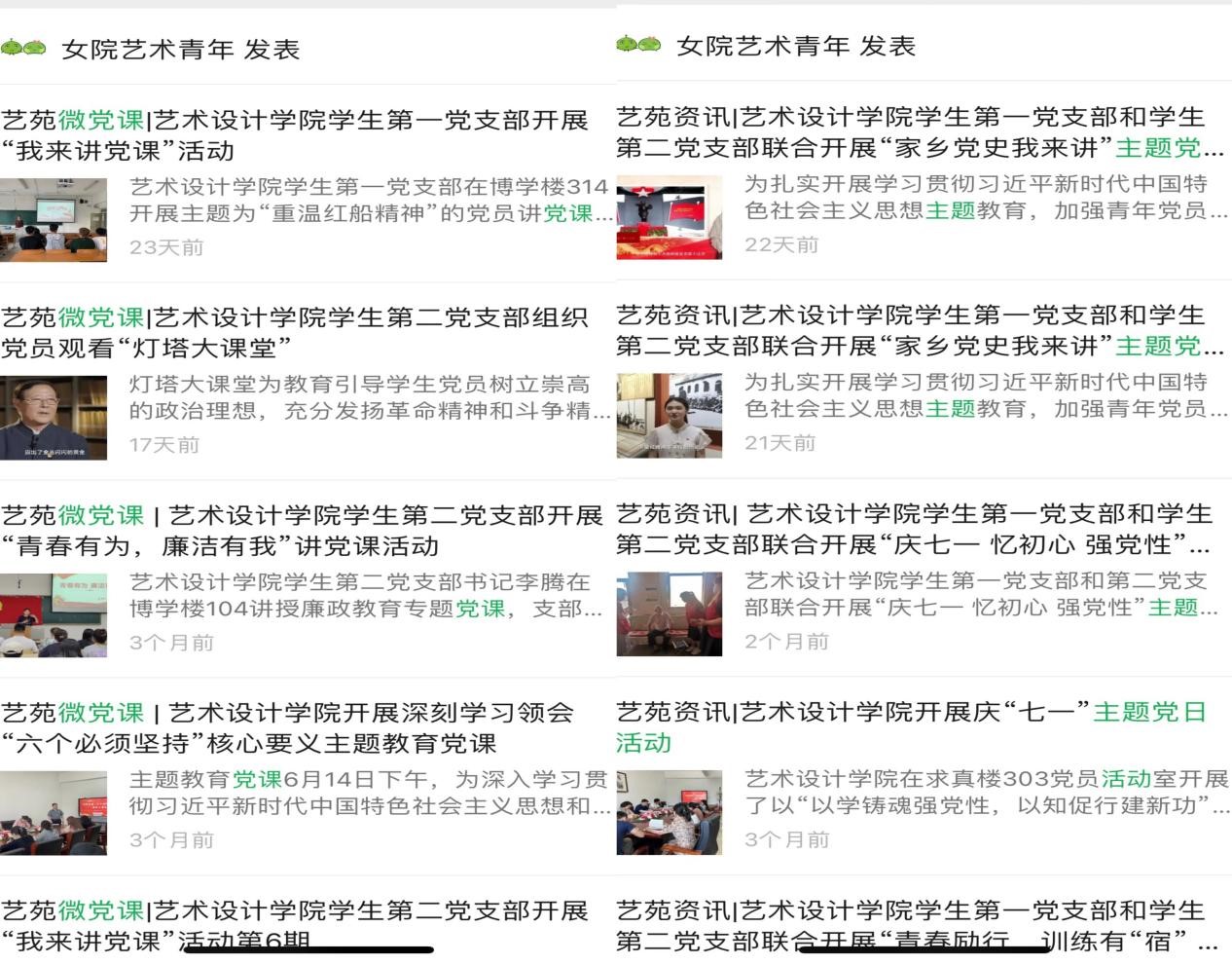 立足“党建+课程”,营造浓厚学习氛围。一是线上教育日常化、全覆盖。支部注重学习形式、学习载体的优化提升,用活线上平台,构建学习堂课“不下线”。利用“学习强国”“灯塔党建在线”平台资源,安排学生党员利用碎片化时间进行理论学习,启用平台“学习园地”模块,定期上传学习资料,定期更新“心得体会”,截止目前已收到心得体会60余篇,使用“学习测试”模块开展“知识竞赛”,让理论学习走深走实,形成学习闭环。二是线下教育常态化、重点化。为进一步增强党课在党员教育中的针对性和有效性,结合学院学生党员特点,开展“艺苑微党课”活动,以“红色故事”“党史故事”“习近平新时代中国特色社会主义思想”为主题,每次由一名学生党员主讲,将大理论细化为小选题,用小故事展现大道理,从构建知识框架着眼、从加深党员个人与事件的联系切入,划重点、说关键,并在党员大会上开展学习分享,实现从“要我学”到“我要学”的转变,持续夯实学习效果,让理论学习既有意义,又有意思,截止目前,累计讲党课19次。