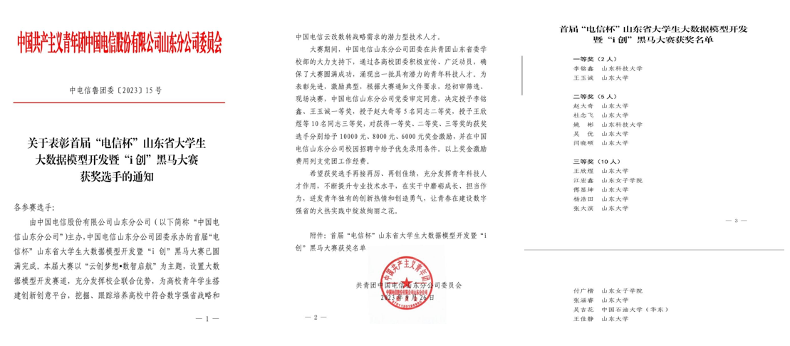 近日,首届“电信杯”山东省大学生大数据模型开发暨“i创”黑马大赛决赛结果揭晓。数据科学与计算机学院人工智能(校企合作)专业的江宏鑫、付广楷同学从众多参赛选手中脱颖而出,荣获三等奖,及奖金6000元,并获得中国电信山东分公司校园招聘优先录用条件。