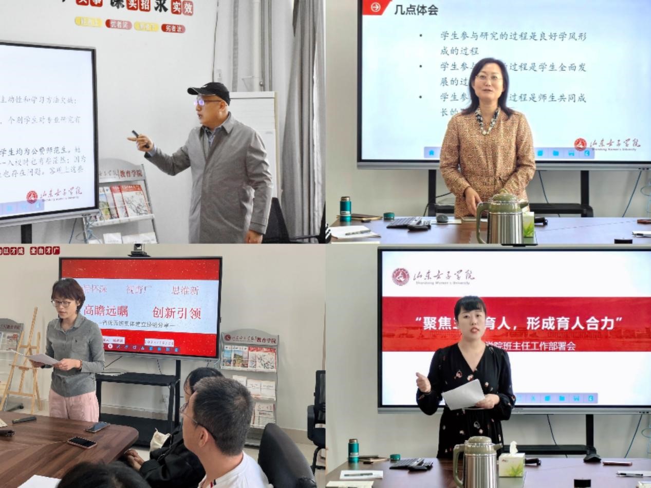会上,路敏书记重点围绕学习目标、学习态度、学习氛围三方面结合前期调研指出了学风建设中存在的问题,通报了学院近两年以来的班级评学排名、集体及个人获奖等情况,希望班主任老师们能对标优秀班级狠抓学风,多管齐下提升育人成效。接下来路书记带领全体参会老师深入学习《山东女子学院班主任工作条例》《“匠心学工 转识成智”质量提升工程实施意见》等文件精神,传达并部署下一步重点工作任务。