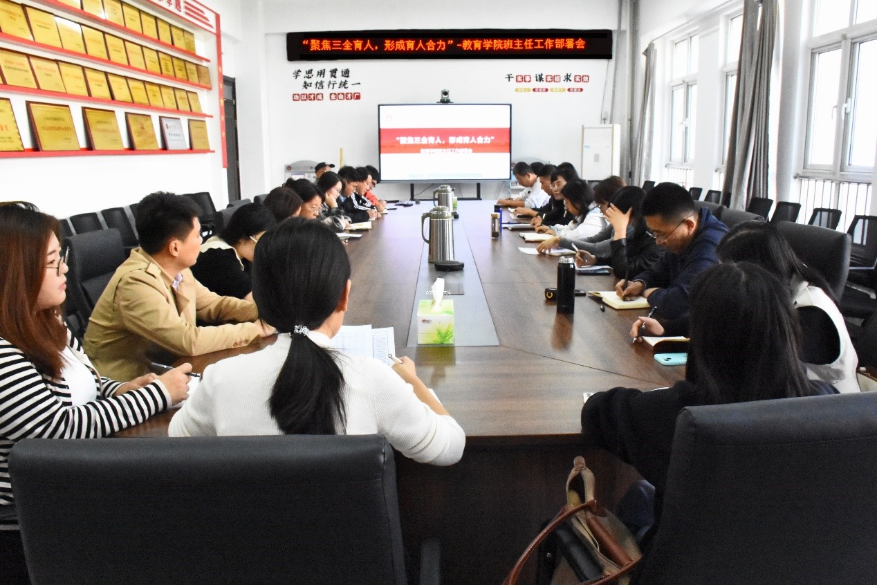 为落实立德树人根本任务,建设一支高素质的班主任工作队伍,全面推进教育学院学生工作高质量发展,10月26日中午,教育学院于博雅楼A303开展班主任工作部署会。本次会议由教育学院党委副书记路敏主持,全体班主任、辅导员参会,学院党委书记崔江宁出席会议。