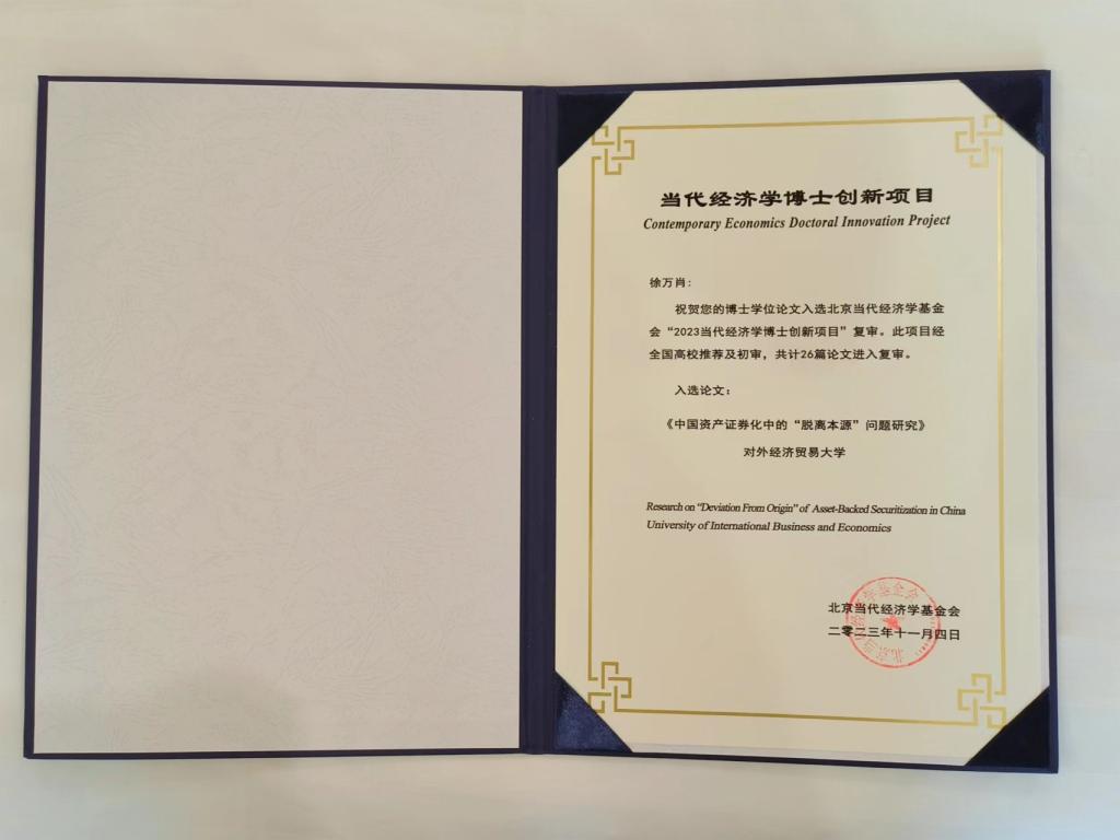 11月5日,由当代经济学基金会和暨南大学经济学院主办的当代经济学博士创新项目证书授予仪式暨学术交流会在广州召开。此项目经全国高校推荐及初审,从134篇毕业论文中选出26篇进入复审。经济学院青年教师徐万肖博士的毕业论文《中国资产证券化中的“脱离本源”问题研究》成功入选,并在会议中做了汇报。