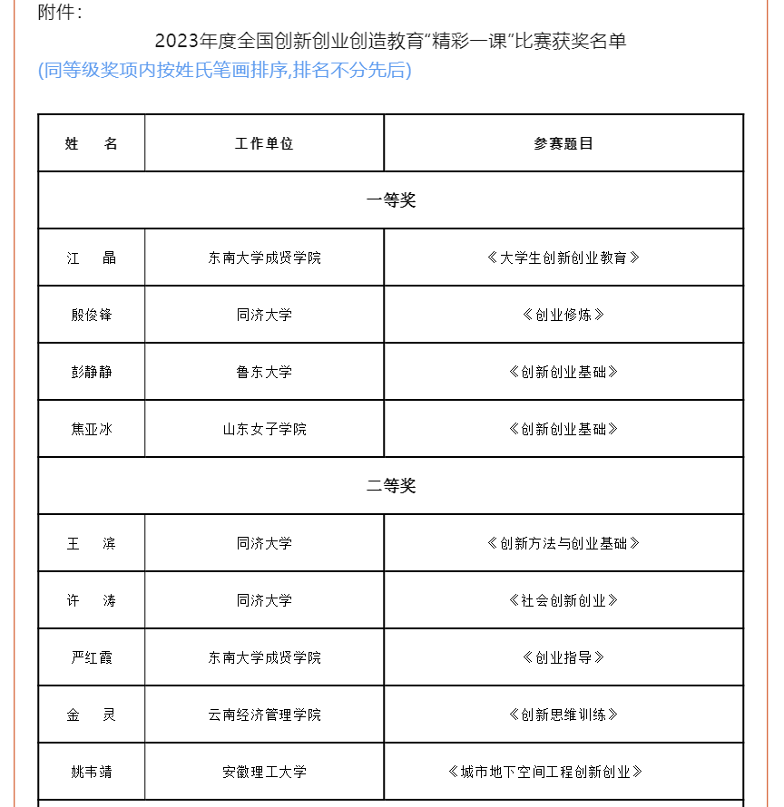 全国创新创业创造教育‘精彩一课’列入“2023全国普通高校教师教学竞赛清单”,并作为教学竞赛维度纳入2023版全国普通高校教师教学发展指数。本届比赛自4月份发布通知以来,收到来自同济大学、东南大学成贤学院、安徽理工大学等多所院校教师报名材料。决赛现场,参赛选手围绕课程内容、教学设计、教学方法、创新特色、教学评价等方面展开“说课”,评委现场作精彩点评,最终评选出一等奖4项、二等奖5项、三等奖7项。