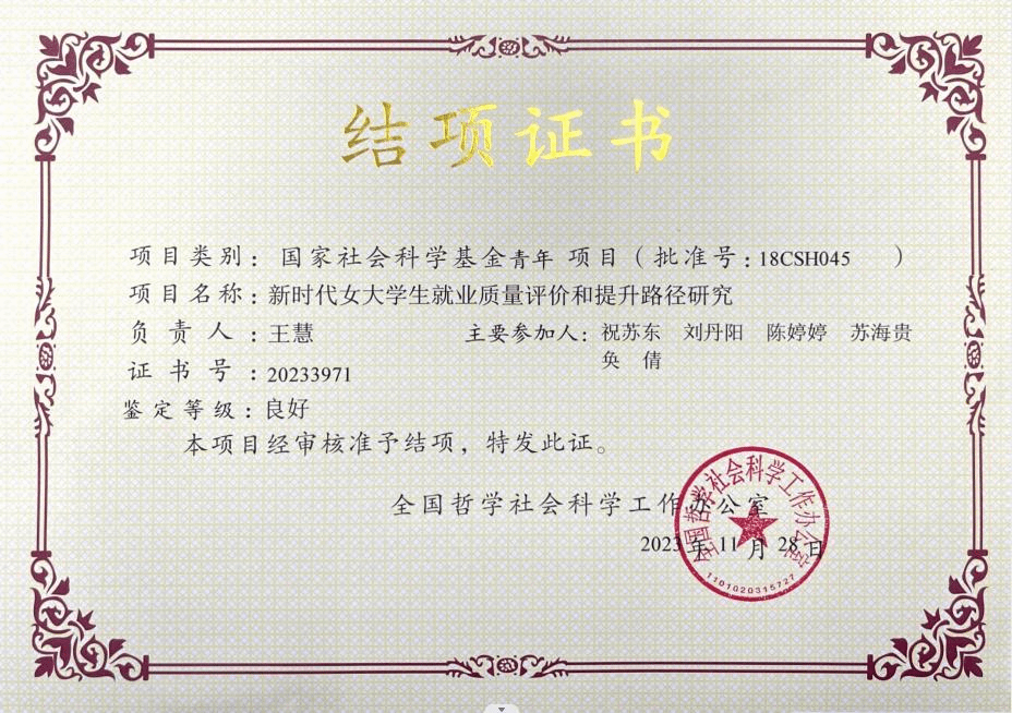 近日,全国哲学社会科学工作办公室公布了2023年11月国家社会科学基金结项情况。学校王慧教授主持完成的国家社会科学基金青年项目《新时代女大学生就业质量评价和提升路径研究》结项鉴定为“良好”等级。
