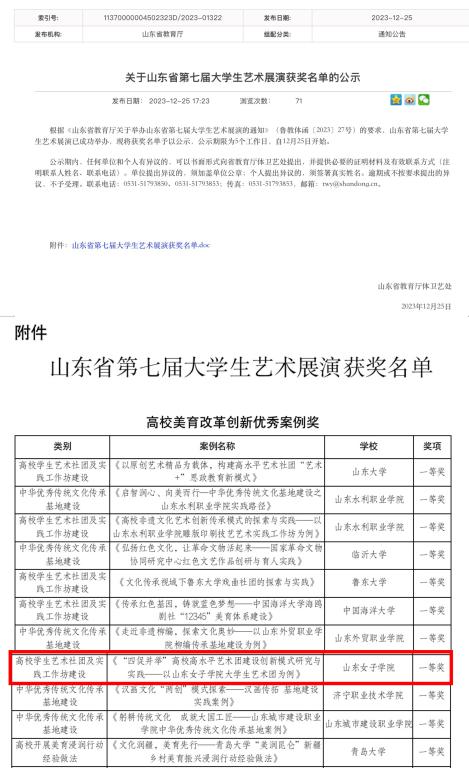 近日,山东省教育厅公布山东省第七届大学生艺术展演获奖名单,我校音乐学院选送的《“四促并举”高校高水平艺术团建设创新模式研究与实践——以山东女子学院大学生艺术团为例》荣获高校美育改革创新优秀案例一等奖,这也是我校首次夺得该项目的一等奖。