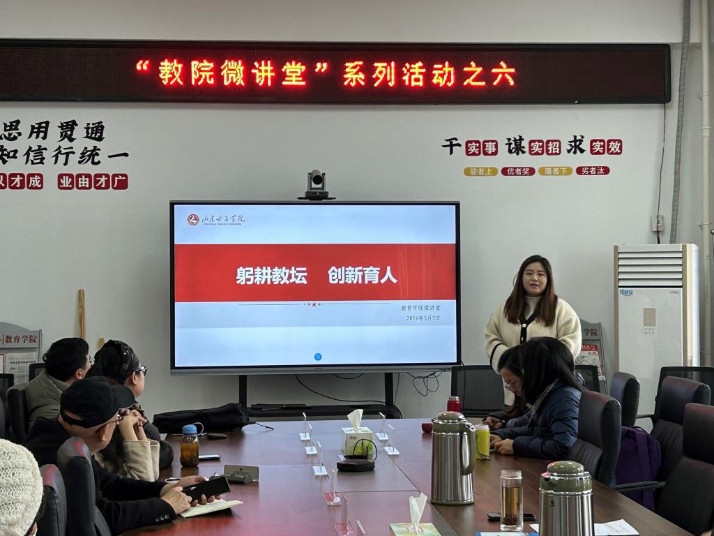 为深入学习贯彻党的二十大精神,巩固学习贯彻习近平新时代中国特色社会主义思想主题教育成果,深学细悟党的创新理论,推动党建与业务工作互促互融,3月7日,教育学院举行2024年首期“教院微课堂”,学前教研室刘阳担任主讲,副院长(主持工作)王飞主持,全体教职工参加。