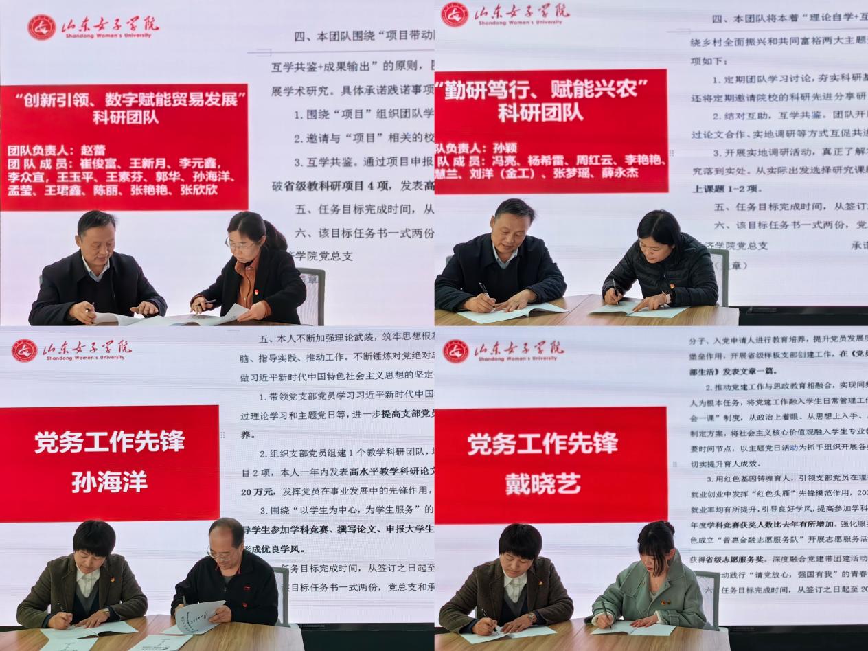 经过党员先锋示范创建基本条件筛查、党员推荐、支部审核、评选活动领导小组审定等环节,2个团体和2名党员同志分别获得“共产党员先锋岗”和“党务工作先锋”称号。签订仪式上,院长沈传河同志分别同“创新引领、数字赋能贸易发展”科研团队、“勤研笃行、赋能兴农”科研团队签订共产党员先锋岗目标责任书,党总支书记齐振花同志与孙海洋同志、戴晓艺同志签订党务工作先锋目标责任书。会议强调,党员先锋示范创建目标责任书的签订,不仅是一份约定,更是一份承诺、一种责任和使命。